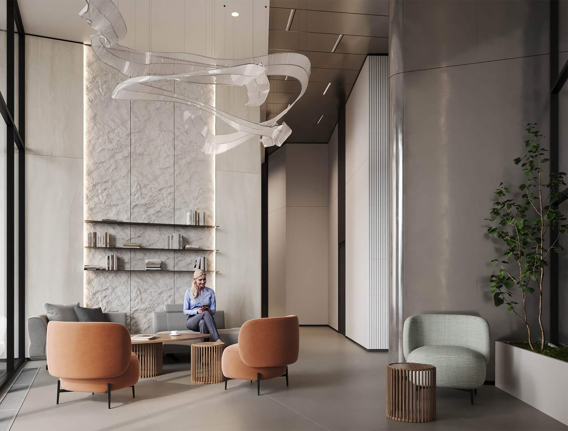 Лобби жилых корпусов продуманы как уютные общественные гостиные. Здесь можно провести встречу, пообщаться с соседями или комфортно поработать за ноутбуком. Современный дизайн, мягкие зоны для отдыха и рабочие пространства делают лобби многофункциональными и стильными.