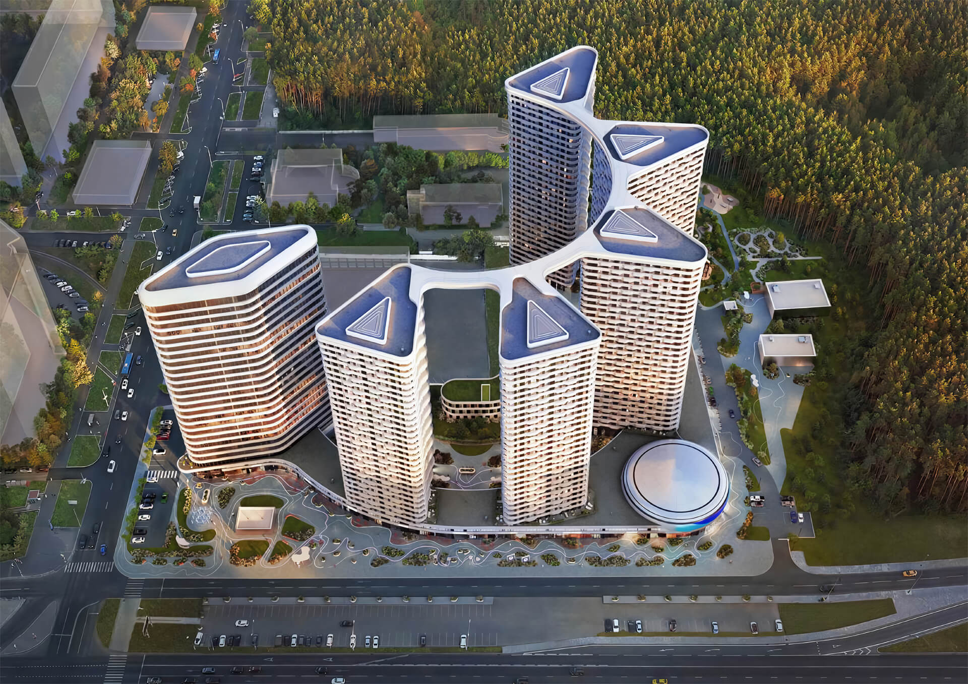 Архитектурная концепция комплекса от бюро «Горпроект» воплощает идею футуризма и гармонии с окружающей средой. Шесть бионических башен, включая офисный центр, объединены общим стилобатом, где разместится гастрономическая улица. Парящий карниз придаёт зданиям лёгкость и уникальный стиль, а с высоты птичьего полёта комплекс напоминает часть шестерёнки, продолжая технологичную тематику.