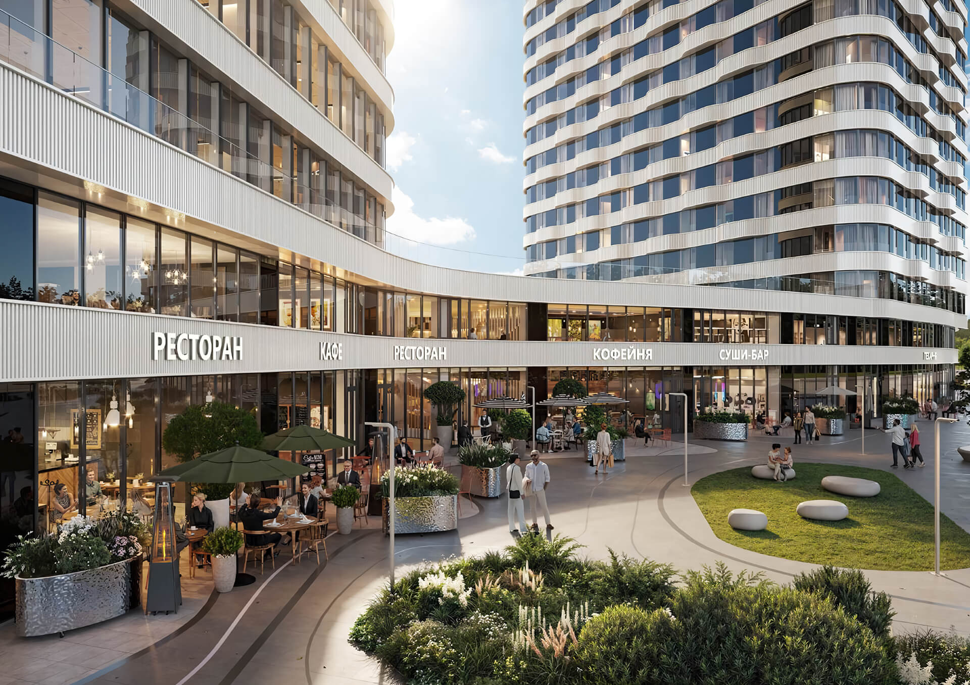 Инфраструктура комплекса включает все необходимое для комфортной жизни. На первых этажах разместятся рестораны, кофейни, и стритфуд-зоны от ведущих рестораторов Москвы. Гастрономическая улица протяжённостью 250 метров станет любимым местом для встреч и отдыха.